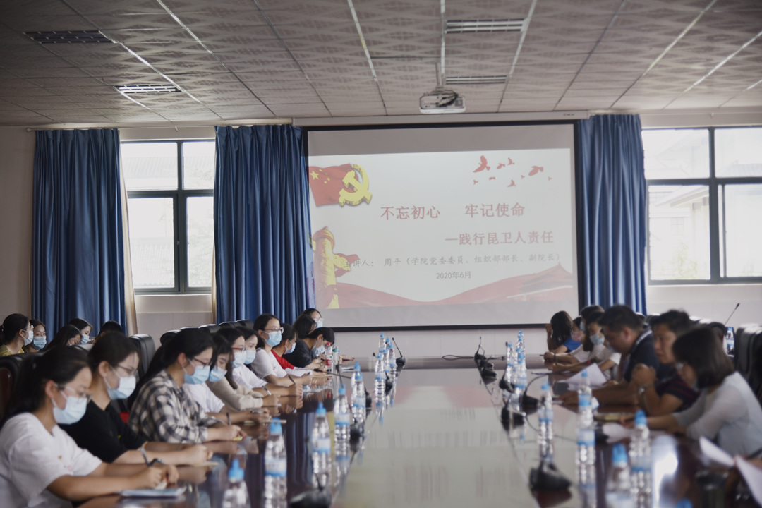 会上,党委委员、组织部部长、副院长周平以《不忘初心,牢记使命——践行昆卫人责任》为题给毕业生党员上了最后一课。他表示,在抗击疫情这场大考中,昆卫学子作为亲历者与参与者,展示出了青年学子朝气蓬勃的精神风貌。在即将迈入人生新的旅程之时,周副院长对毕业生党员提出了殷切希望:秉承“明德慎思 博学济世”的校训,勇于承担新时代青年的责任,坚守初心、磨砺恒心、保持戒心、常怀爱心,奔赴更广阔的天空,做传播爱的使者。