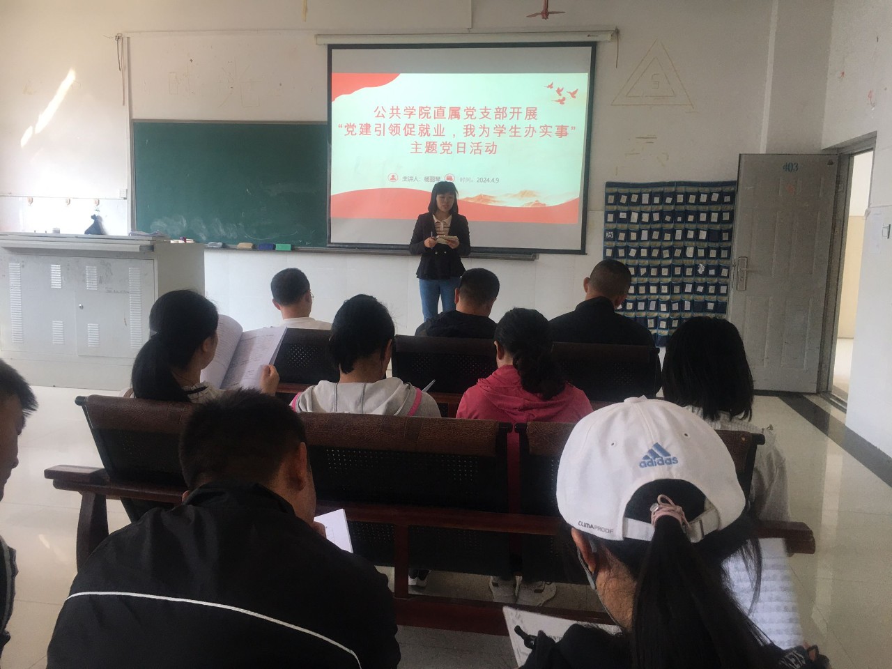 为深入学习习近平新时代中国特色社会主义思想和党的二十大精神,贯彻落实习近平总书记关于高校毕业生就业工作的重要指示批示精神,进一步深化学院毕业生就业创业指导与服务工作,形成全院党员关心学生就业、参与学生就业、重视学生就业的良好局面和氛围,2024年4月9日,公共学院直属党支部开展“党建引领促就业,我为学生办实事”主题党日活动,助力帮扶临床学院2024届困难群体毕业生就业。本次活动由党支部书记杨丽琴主持。