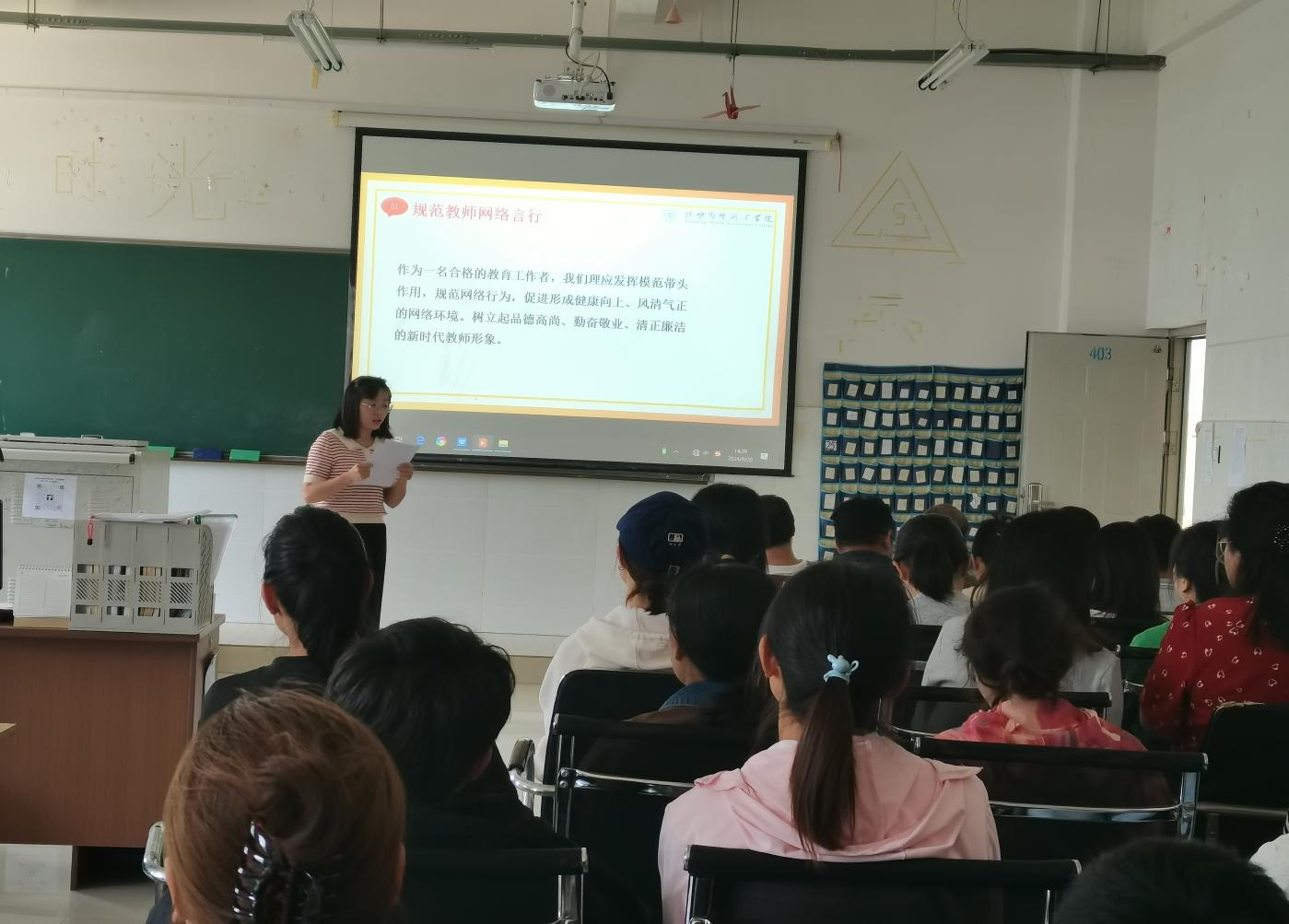 会上,杨丽琴重温领学《新时代高校教师职业行为十项准则》、 《中共今年会官方网站委员会关于印发教职工违反职业道德行为处理办法(试行)的通知》以及《第四批违反教师职业行为十项准则及违纪违法典型案例》等文件。强化广大教师对职业行为规范的了解,引导广大教师潜心教学,努力成为有理想信念、有道德情操、有扎实学识、有仁爱之心的“四有”好老师。同时通过一个个师德失范典型案例的学习,要求教师们进一步认识到师德师风是教师职业的生命线,必须时刻坚守,不容有丝毫懈怠。