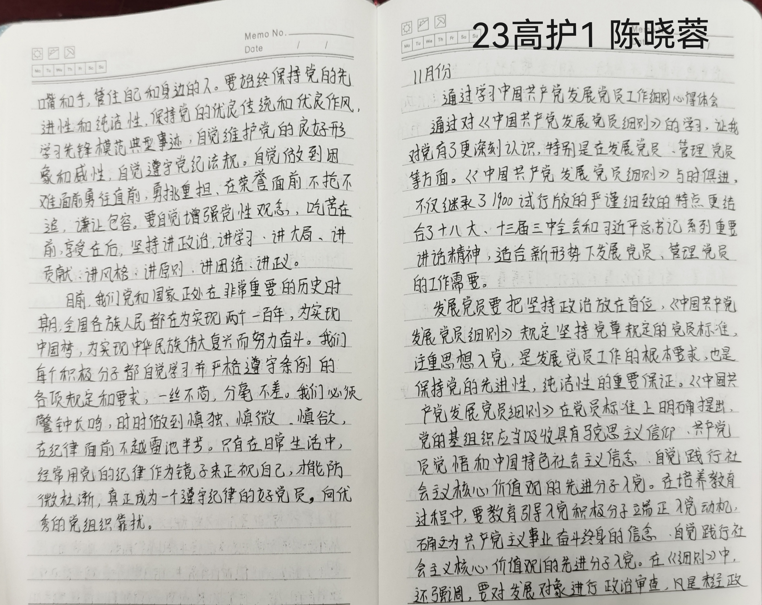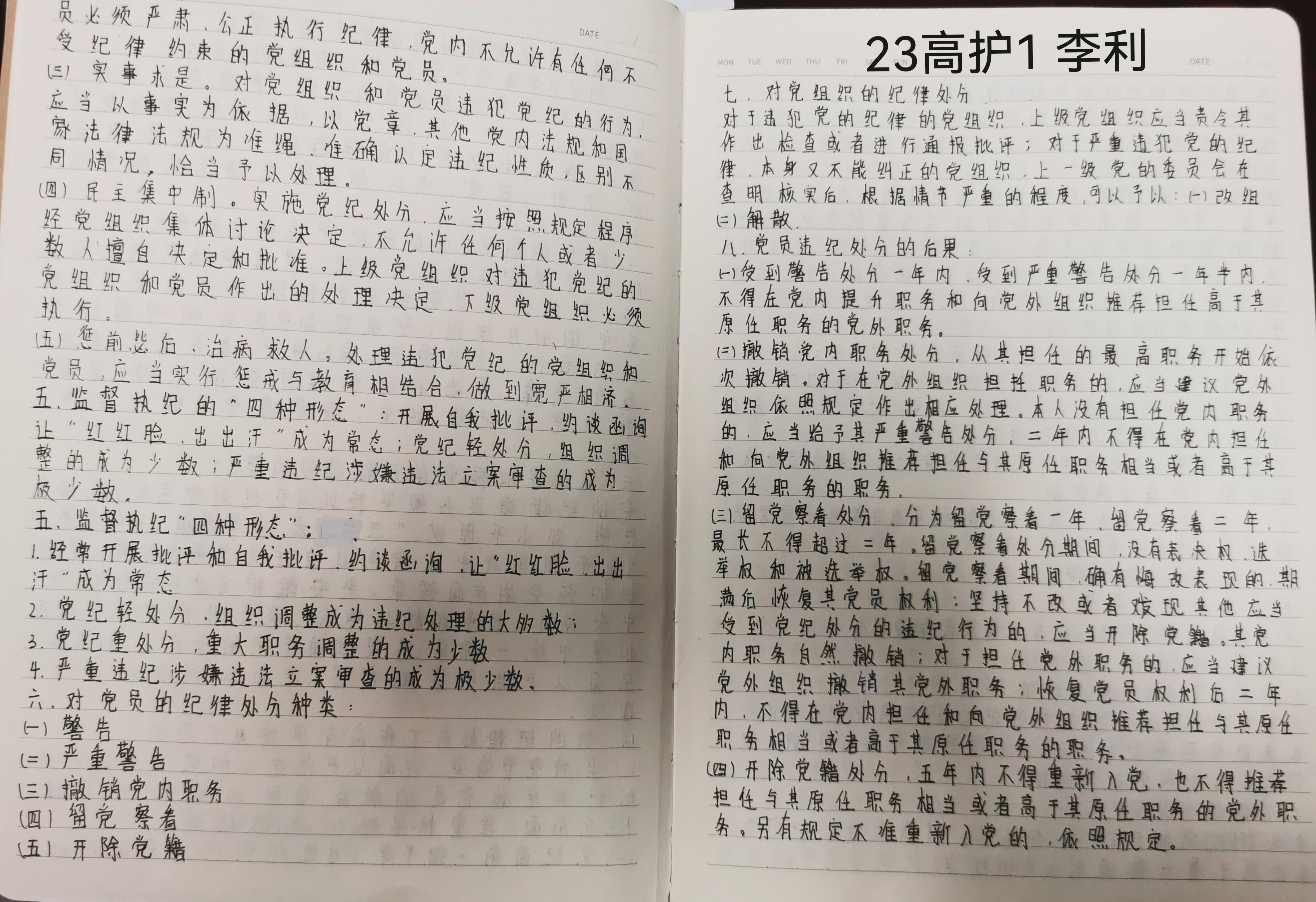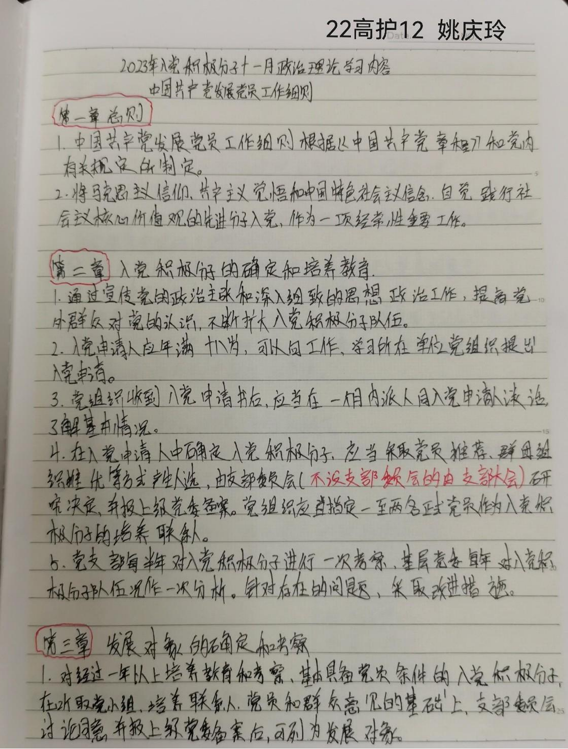 按照护理学院第一党支部统一安排部署,此次评选活动主要围绕“记录齐全、内容详实、格式规范、字迹工整、页面整洁”等方面对支部自愿上交的36份学习笔记进行评比,着重了解党员、入党积极分子、入党申请人的学习态度与学习深度。经过综合评审,最终赵海凤、彭锦丹、李利、陈晓蓉、姚庆玲、宋贤6名同学的笔记被评为优秀笔记,并在全院范围内予以通报表扬。下面是护理学院第一党支部评选出的优秀学习笔记,让我们来看看吧!(排名不分先后)