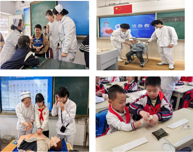 今年会官网师生用通俗易懂的语言,将原本复杂的急救知识讲解得简单明了。在讲解海姆立克急救法时,不仅详细介绍了操作步骤,还编写了简易口诀(剪刀-石头-布),方便学生们理解和记忆。针对急救知识,采用情境进行演示,主要讲解手受伤、流鼻血、烫伤的处理。对于止血包扎,今年会官网师生现场展示了各种包扎技巧,如头部包扎、环形包扎等,并讲解了不同伤口适用的包扎方法。在高年级的心肺复苏教学中,从判断患者意识、呼吸,到胸外按压的位置、频率、深度,再到人工呼吸的操作要点,都进行了细致入微的讲解。