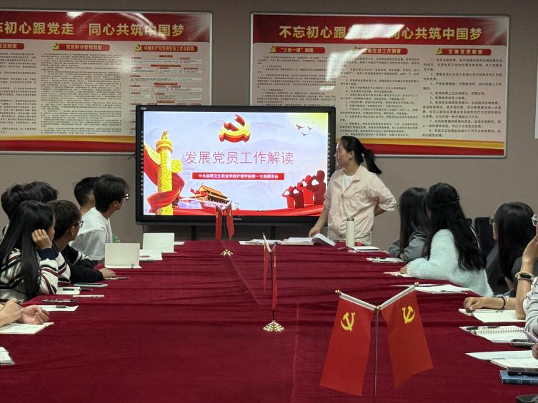 为深入贯彻党的二十大关于“加强党的建设,做好新时代党员发展工作”的部署要求,切实加强入党申请人理想信念教育,引导青年群体筑牢信仰根基、明晰入党路径,10月9日19:30,护理学院第一党支部在党员活动室开展 2025 年入党申请人首次专题培训,主题为“以青春之我,叩响入党初心之门”。支部书记蒋晓羽主讲,19 名入党申请人全员参加,旨在通过系统培训强化申请人的政治认同、思想认同、理论认同、情感认同,为党员队伍建设储备高素质青年力量。