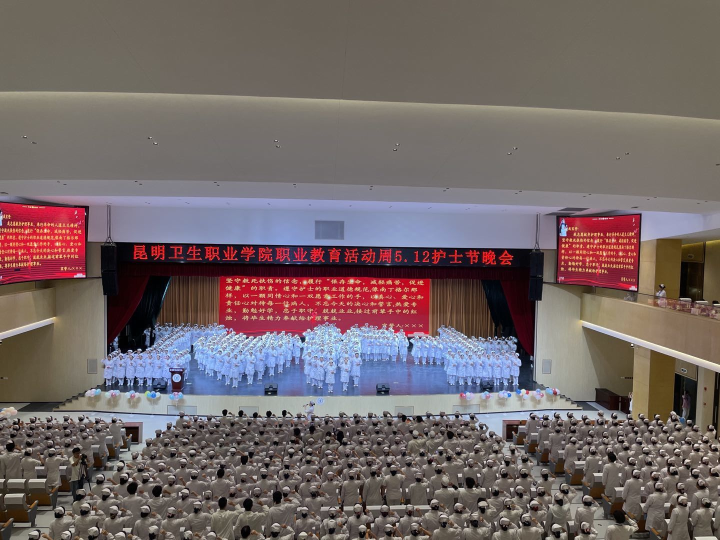 健康所系,性命相托,终身纯洁,忠贞职守。为迎接第110个国际护士节,弘扬南丁格尔精神,传承护理文化,丰富校园生活,使学生稳固职业思想,提升职业素养,塑造职业形象,培育创先争优意识。结合今年会官方网站职业教育活动周方案,护理学院于5月25日晚19:00在明德会堂举行了以“传承红色基因 创新发展护理”为主题的5·12护理晚会。