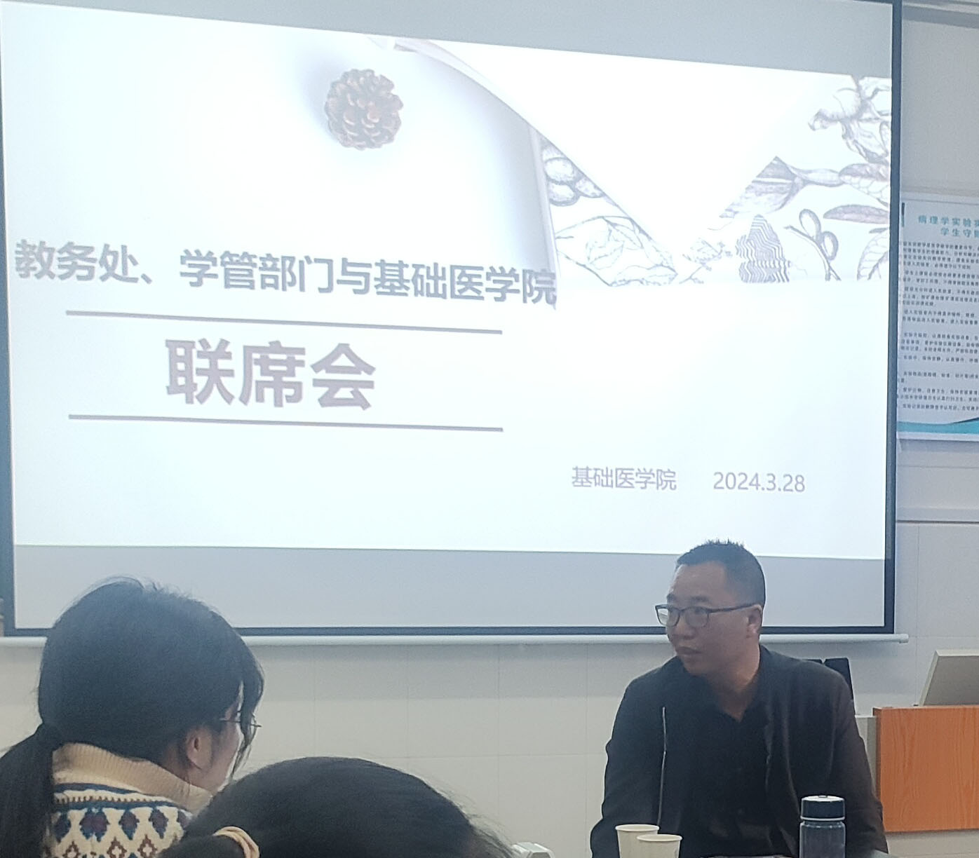 为贯彻落实学校“真教、真学、真督”理念,2024年3月28日下午,基础医学院与教务处、大学生工作部和其他二级学院学管部门组织召开联席会,针对学生转变学习态度,优化学习意识,创新学科学习思维等问题进行讨论,并采取相关措施,高站位、高效率、高标准地提升学生学习素养与质量。