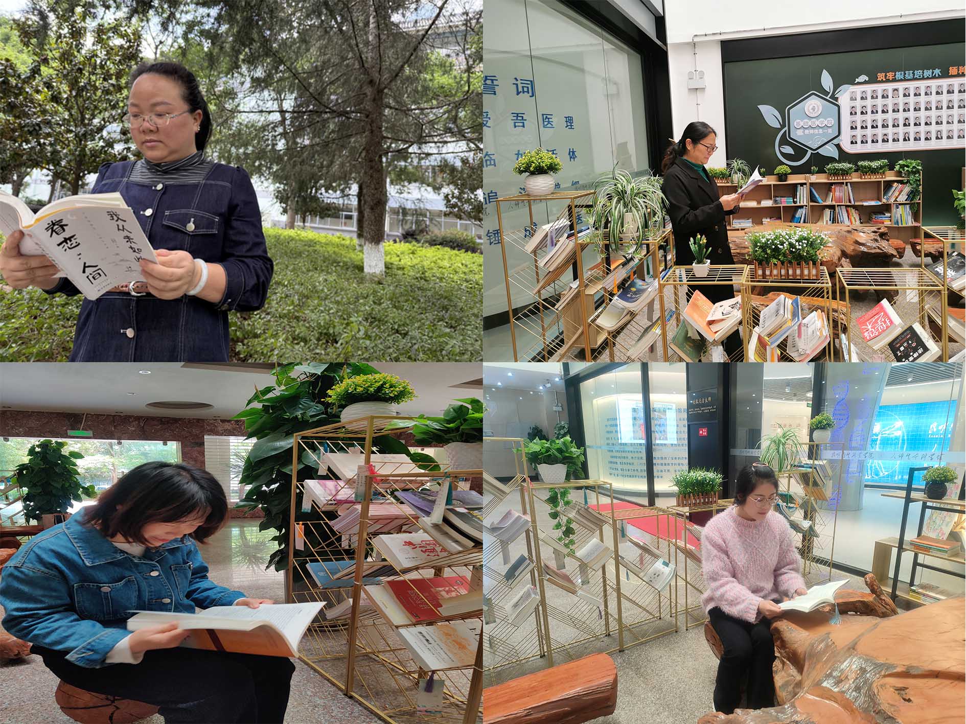 春日暖阳下,教师们选择校园里的一角,阅读自己喜欢的图书,从医学专著到人文社科经典,从心灵成长到历史文学名著,形式多样,内容丰富。