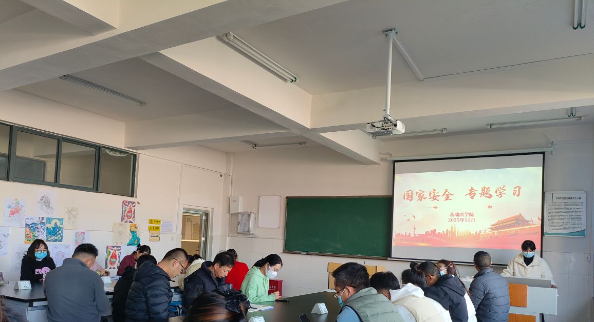 为深入学习贯彻总体国家安全观,切实提升教师的国家安全意识和防范能力,近日,基础医学院以“线上+线下”相结合的方式,组织全体教师开展国家安全专题学习活动,活动由基础医学院直属党支部书记彭莉主持。