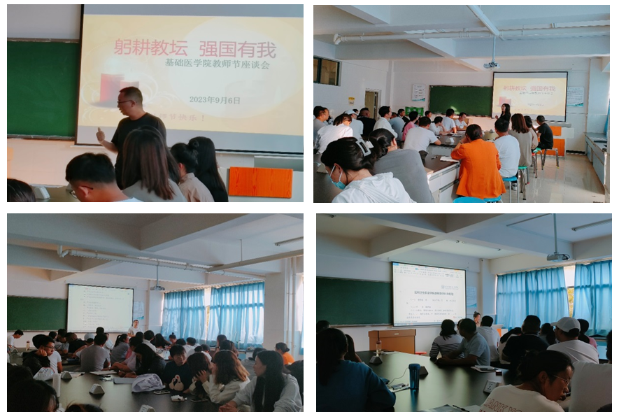 2023年9月6日下午,基础医学院针对即将到来的教师节,开展了 “躬耕教坛,强国有我”的座谈会,激励教师们“为党育才、为国育才”,加强师德师风建设,潜心立德树人。教育兴则国家兴、教育强则国家强,我们要为教育现代化建设而奋斗!