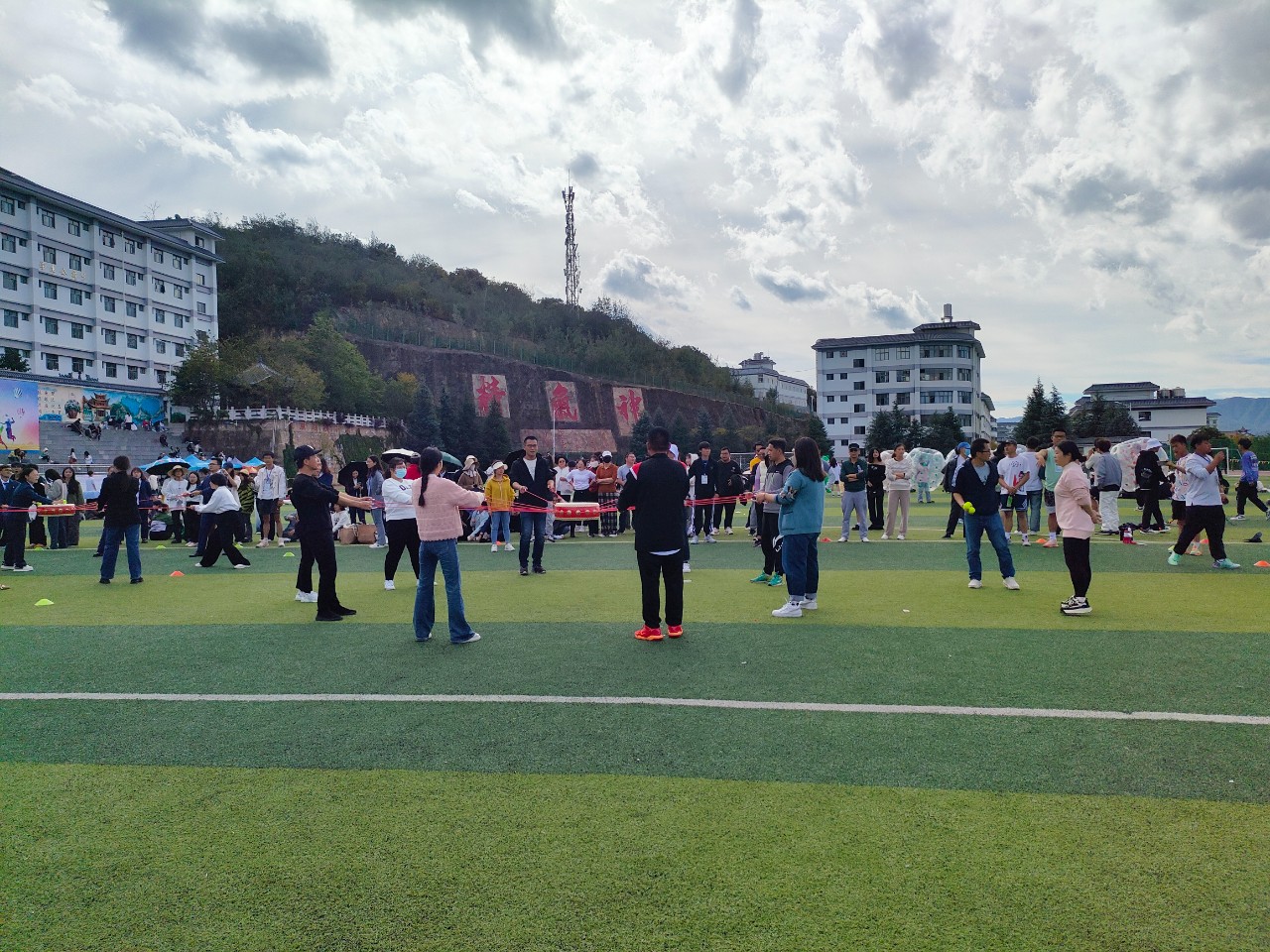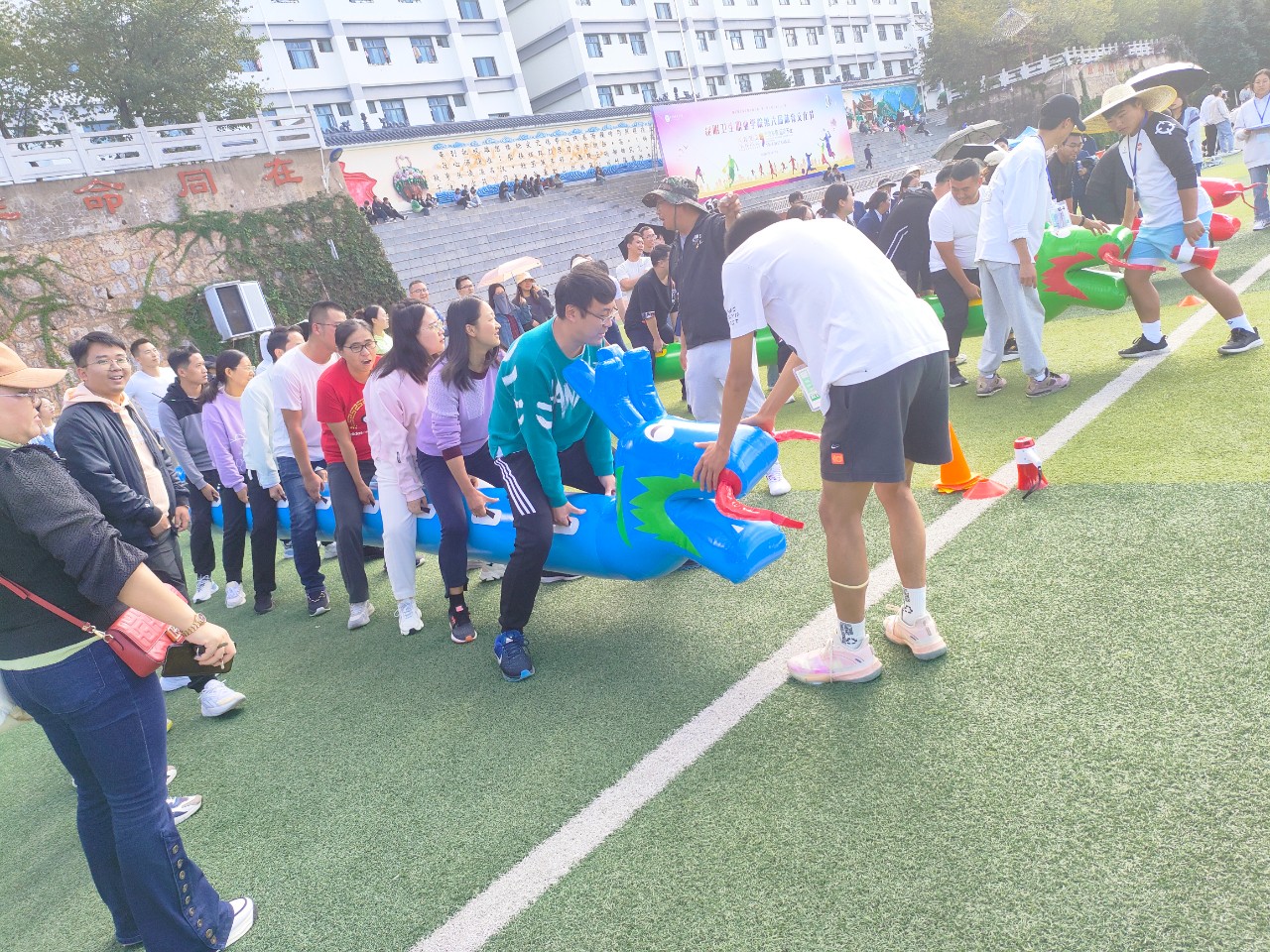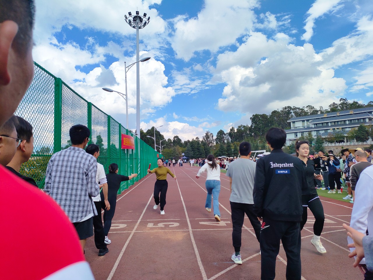 运动会期间,由领导班子牵头,全体教师参与进来。教职工50米迎面接力时,运动员们手握接力棒,健步如飞,举步生风,从起点奔向终点。