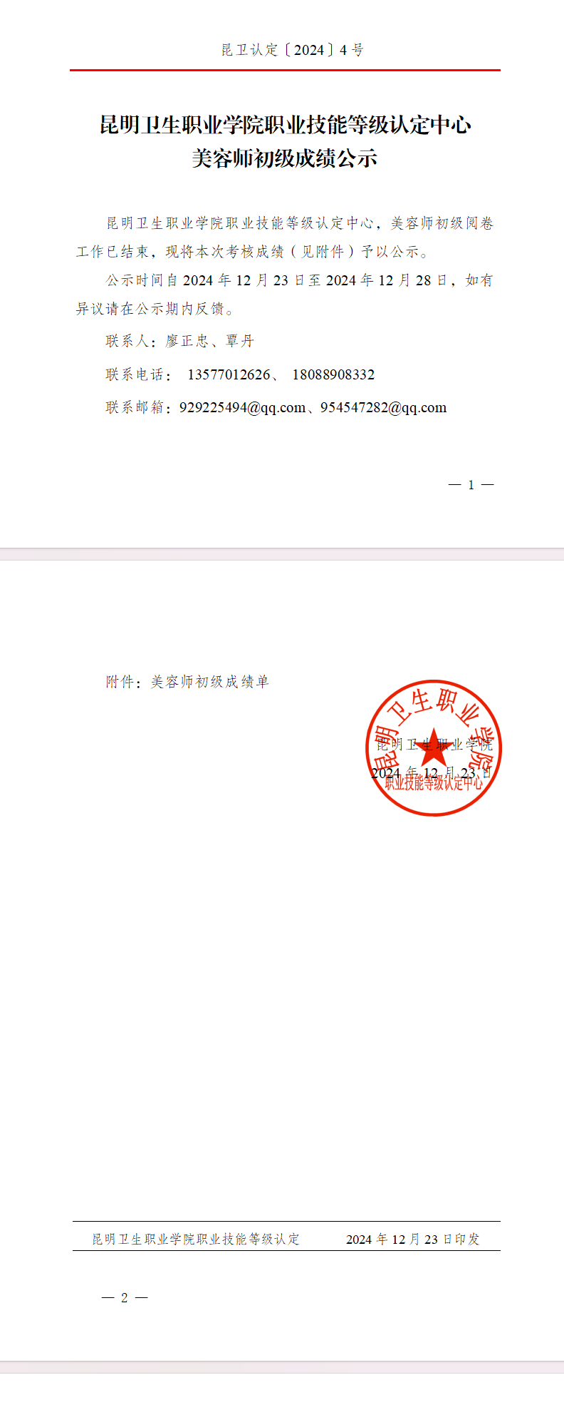 昆卫认定4号文件-美容师初级成绩公示