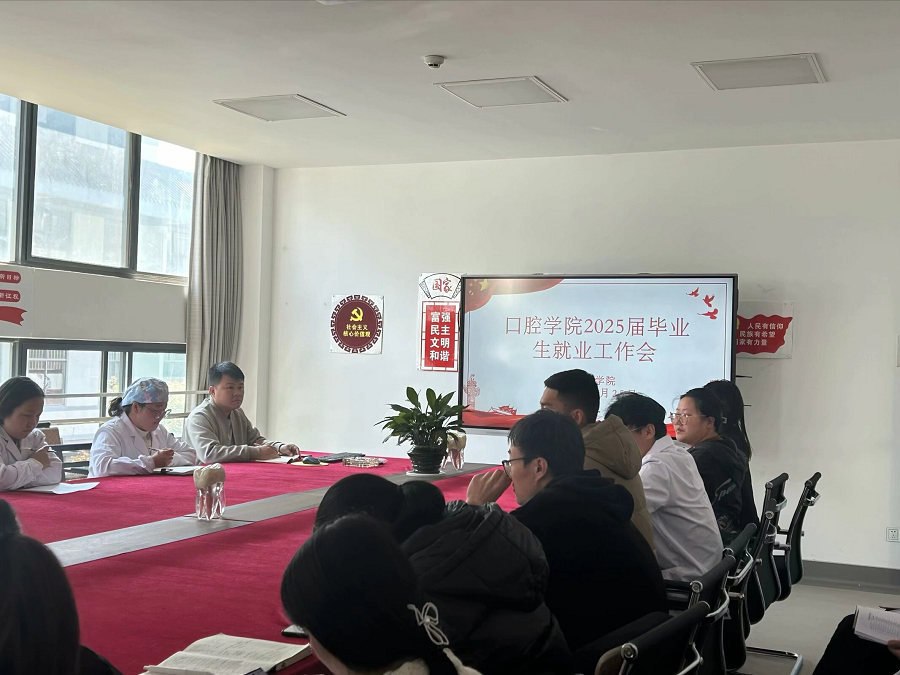 为全面落实推进学校就业工作部署,切实做好2025届毕业生就业服务工作,口腔学院于2025年3月25日在学院会议室召开2025届毕业生就业工作推进会。学院领导班子、全体任课教师及辅导员参加会议。