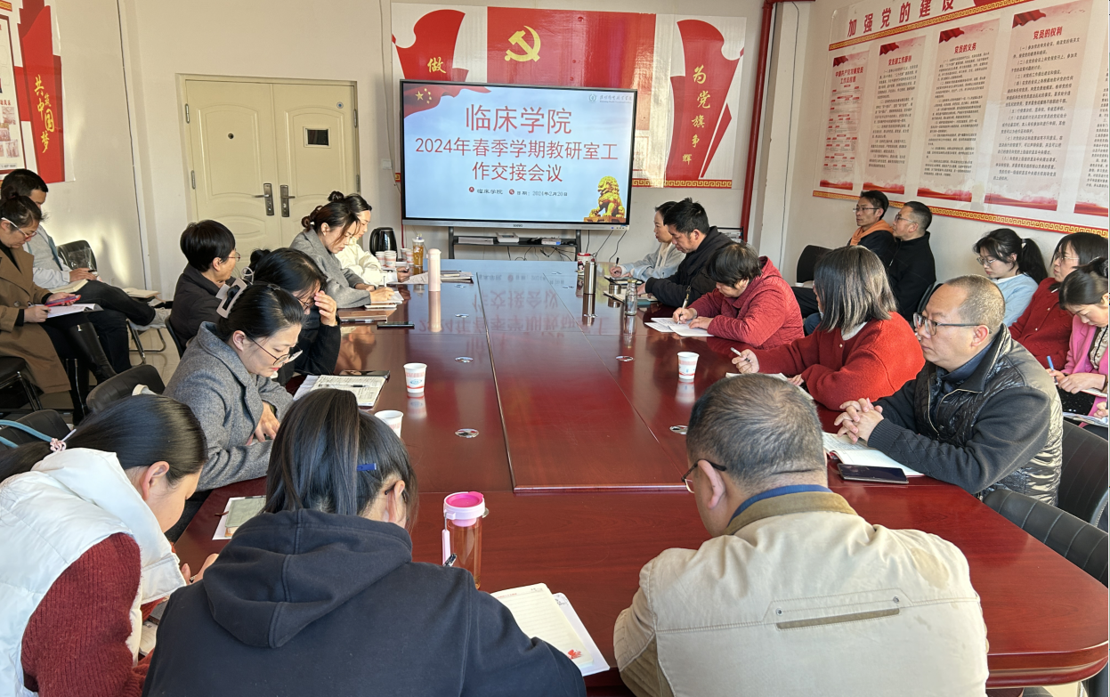 教学质量是学校发展的生命线,为提高教学质量,监督、保证教学计划的实施,临床学院于2024年2月20日8:30在临床学院405会议室召开教研室工作会议。参与本次会议的人员有临床学院党政领导班子、教务处教学管理科科长、教学办全体人员、新老教研室主任。