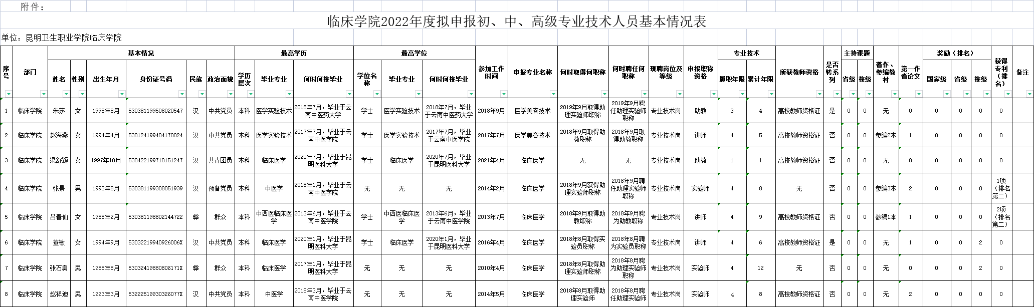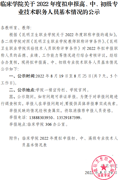 临床学院关于2022年度拟申报高、中、初级专业技术职务人员基本情况的公示