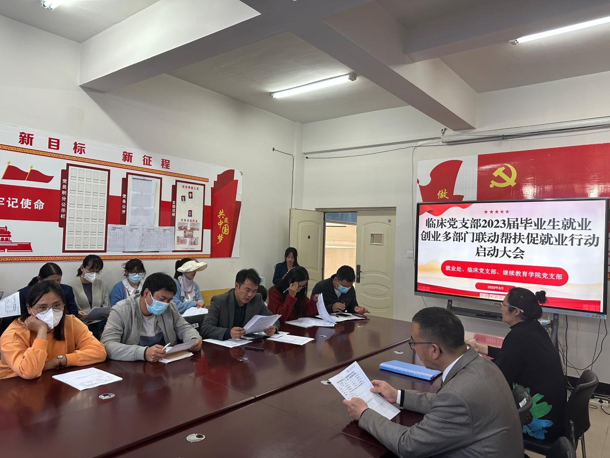 为深人学习贯彻党的二十大精神,全面落实党中央、国务院对高校毕业生就业创业工作的决策部署,按照省委省政府、省委教育工委、省教育厅关于做好高校毕业生就业创业工作的指示精神,结合临床党支部所分管的2023 届临床医学和医学美容专业毕业生就业创业服务和指导的工作实际,在临床学院院长和党支部书记的精心部署和缜密安排下,今年会官方网站就业处、临床党支部、继续教育学院党支部于2023年3月24日16:30-17:30开展了联动帮扶促就业行动启动大会。