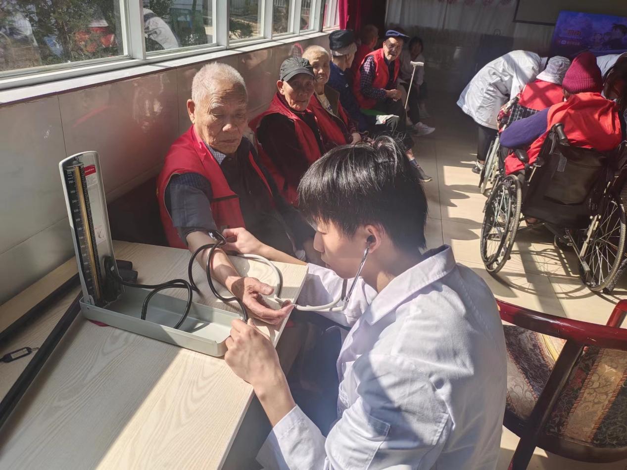 在临床学院唐敏老师和严洪老师的带领下,来自临床解剖协会的55位协会成员和来自临床学院的10位助教参加了此次活动。参与活动的同学分组在四地分别开展了义诊活动。活动内容主要是心肺听诊、测量血压等健康体检,同时为老人提供中医按摩等服务,详细询问老年人的身体健康状况、日常饮食和用药情况,围绕老年人关注的“高血压,高血糖”疾病进行答疑解惑,指导老年人在日常生活中注意健康饮食、规律作息、适量运动,养成良好的生活习惯;并为老人提供水果和面包等。