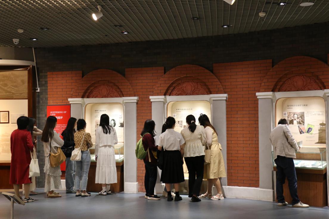 本次活动主要参观聂耳纪念馆一层和二层展厅,一层展厅“匆匆而永恒”,以聂耳短暂的人生时光为主线,全方位、多角度展示人民音乐家聂耳的生平事迹。教师们通过观看历史文献资料、图片、纪录片等形式,深入了解了聂耳先生如何从一个药铺家庭的孩子成长为一个伟大音乐家。一段段文字、一张张老照片、一件件乐器,教师们仿佛穿越到了聂耳先生的时代,亲身感受他在音乐创作时的艰辛与激情。