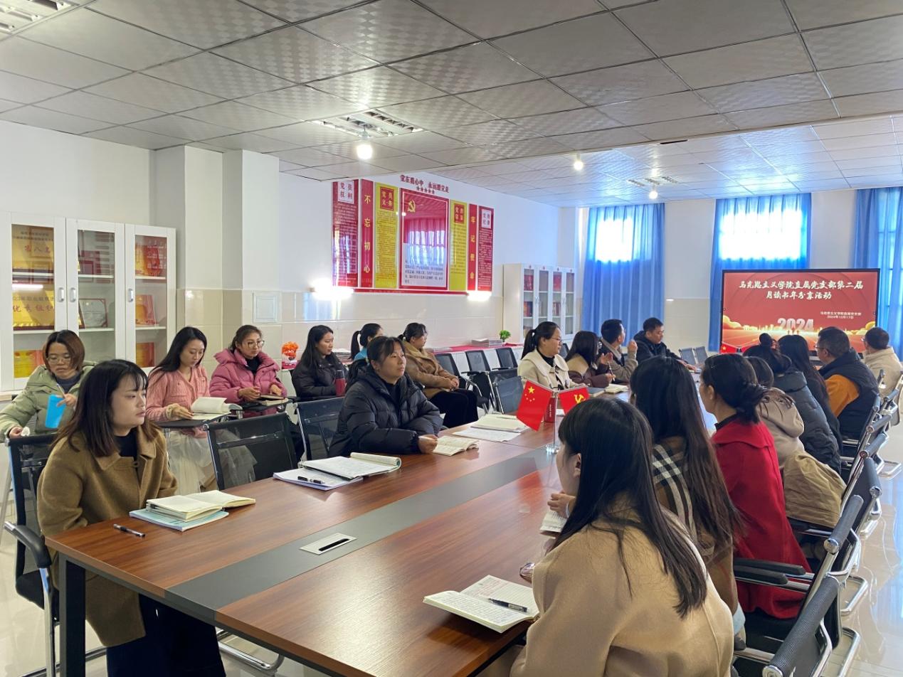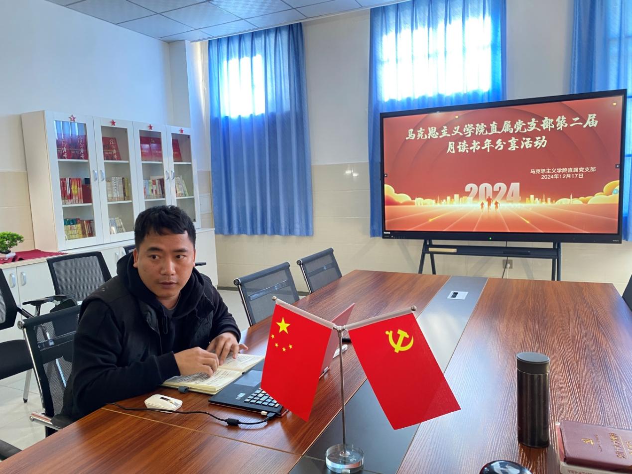 为深入学习习近平新时代中国特色社会主义思想,增强党员的理论素养,提高阅读能力和文化品位,马克思主义学院直属党支部于2024年12月17日下午,在党员活动室成功开展了“2024年度党员月读书分享”主题党日活动。此次活动由党支部书记杨登光主持,旨在通过分享优秀书籍,激发党员的学习热情,促进思想交流,提升整体理论水平。