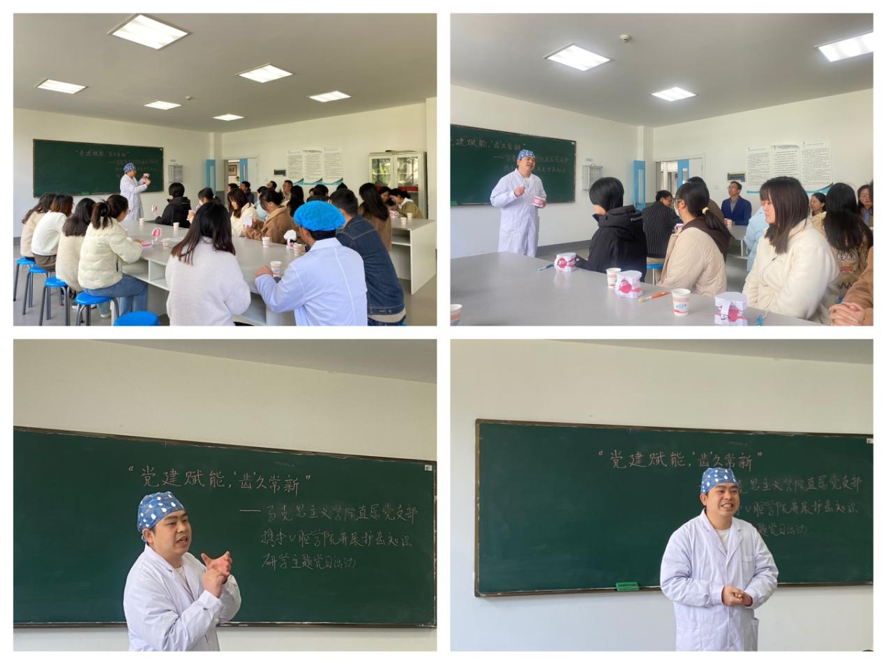 为深入学习贯彻党的二十大精神,推动党建工作与专业实践深度融合,2025年2月26日上午,马克思主义学院直属党支部在口腔学院开展了“党建赋能,‘齿’久常新”主题党日活动。本次活动由支部书记杨登光带队,支部全体党员参加,旨在通过口腔健康知识的学习与实践,增强党员的健康意识,促进跨学科交流。