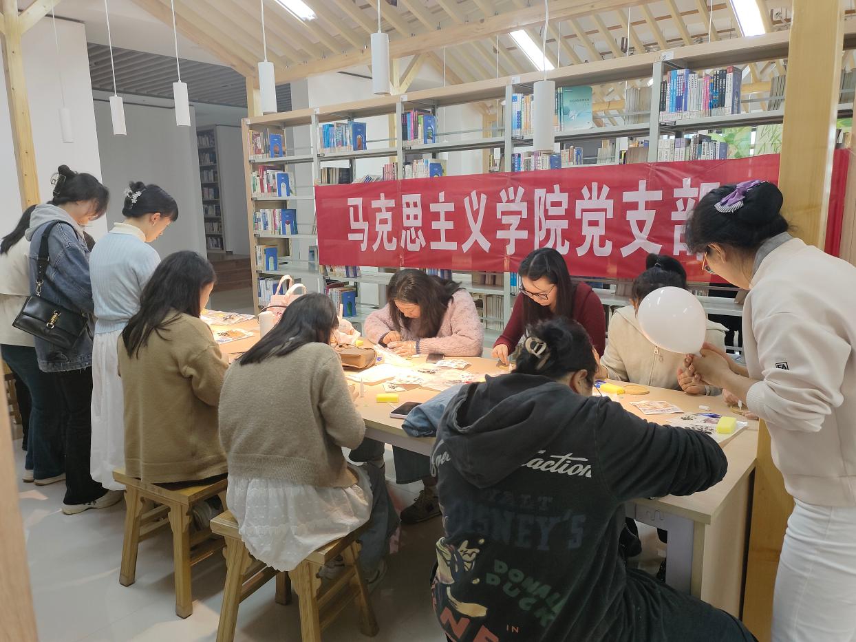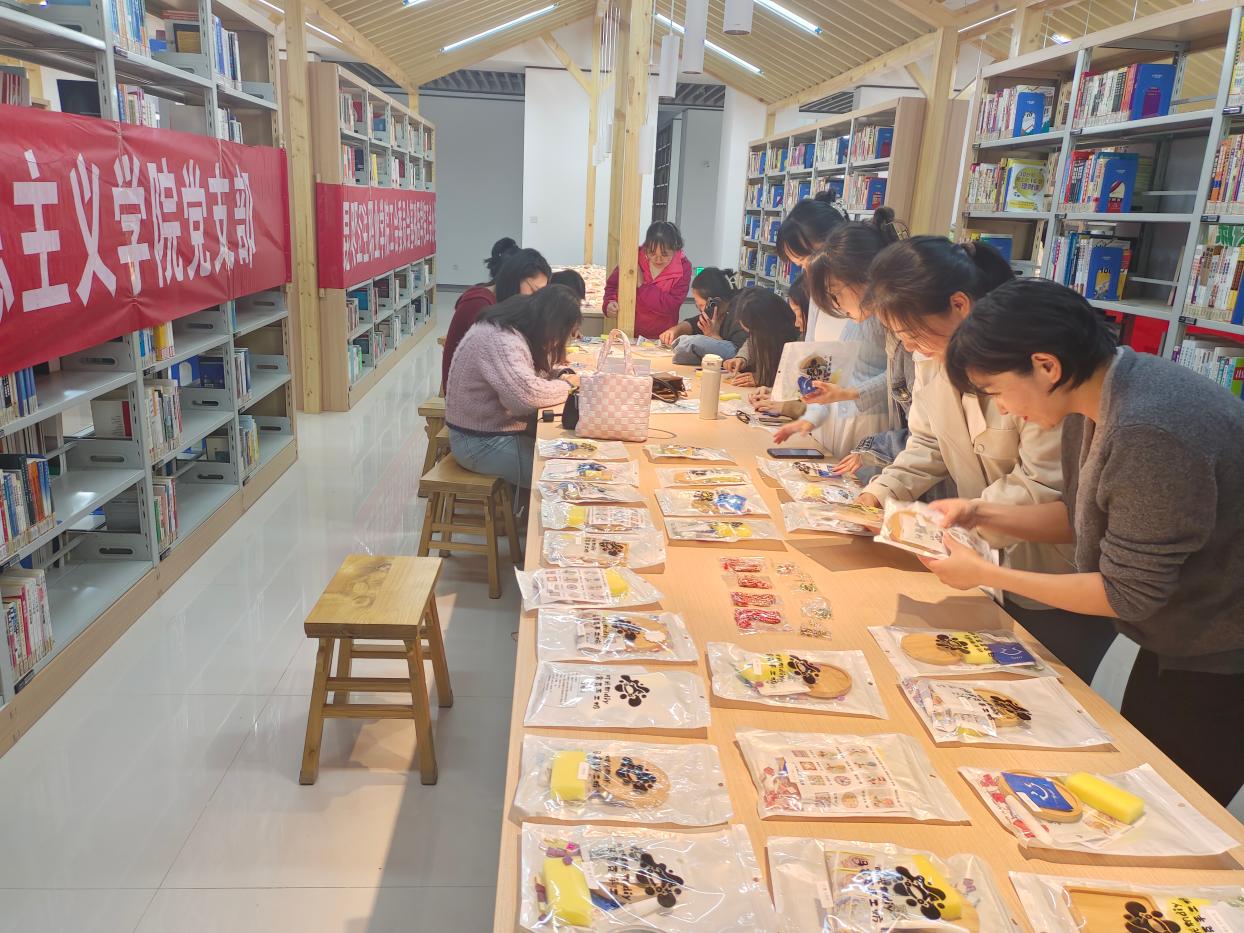 活动现场,“马克思主义学院党支部”的红色横幅格外醒目,营造出浓厚的党建引领氛围。党支部充分发挥引领作用,协同工会小组精心筹备,为教职工们准备了丰富的手工材料,每一处都体现着党建带工建的用心。