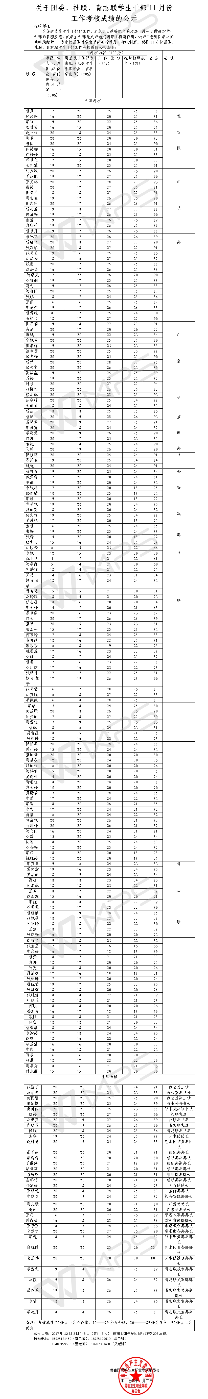 关于团委、社联、青志联学生干部11月份工作考核成绩的公示