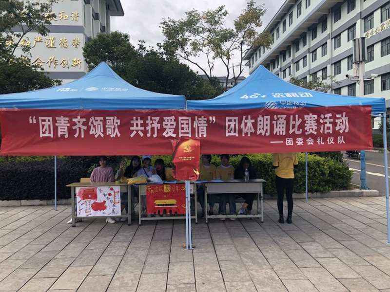 2019年10月29日,团委会礼仪队在小广场举办完了“团青齐颂歌 共抒爱国情”团体朗诵、歌咏比赛。本次活动增强了同学们的集体荣誉感和团结感,激发了同学们的团队合作精神,以合唱和朗诵的方式来表达对祖国的爱国之情,弘扬爱国主义精神。