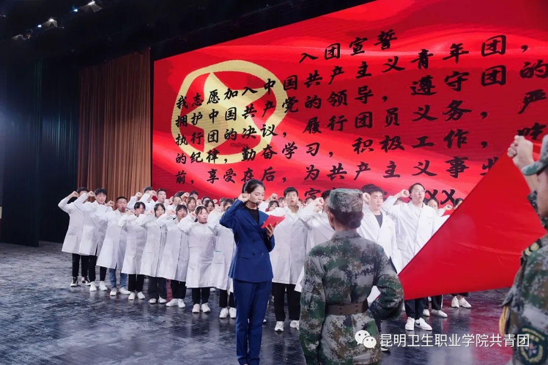 表彰晚会第二个阶段,举行新团员入团宣誓仪式暨老团员重温入团誓词活动。新老团员举起右拳,面对鲜艳的团旗庄严宣誓。青春誓言,高昂雄浑,表达了同学们对共青团组织的无限向往和为团组织增光添彩的豪迈激情。