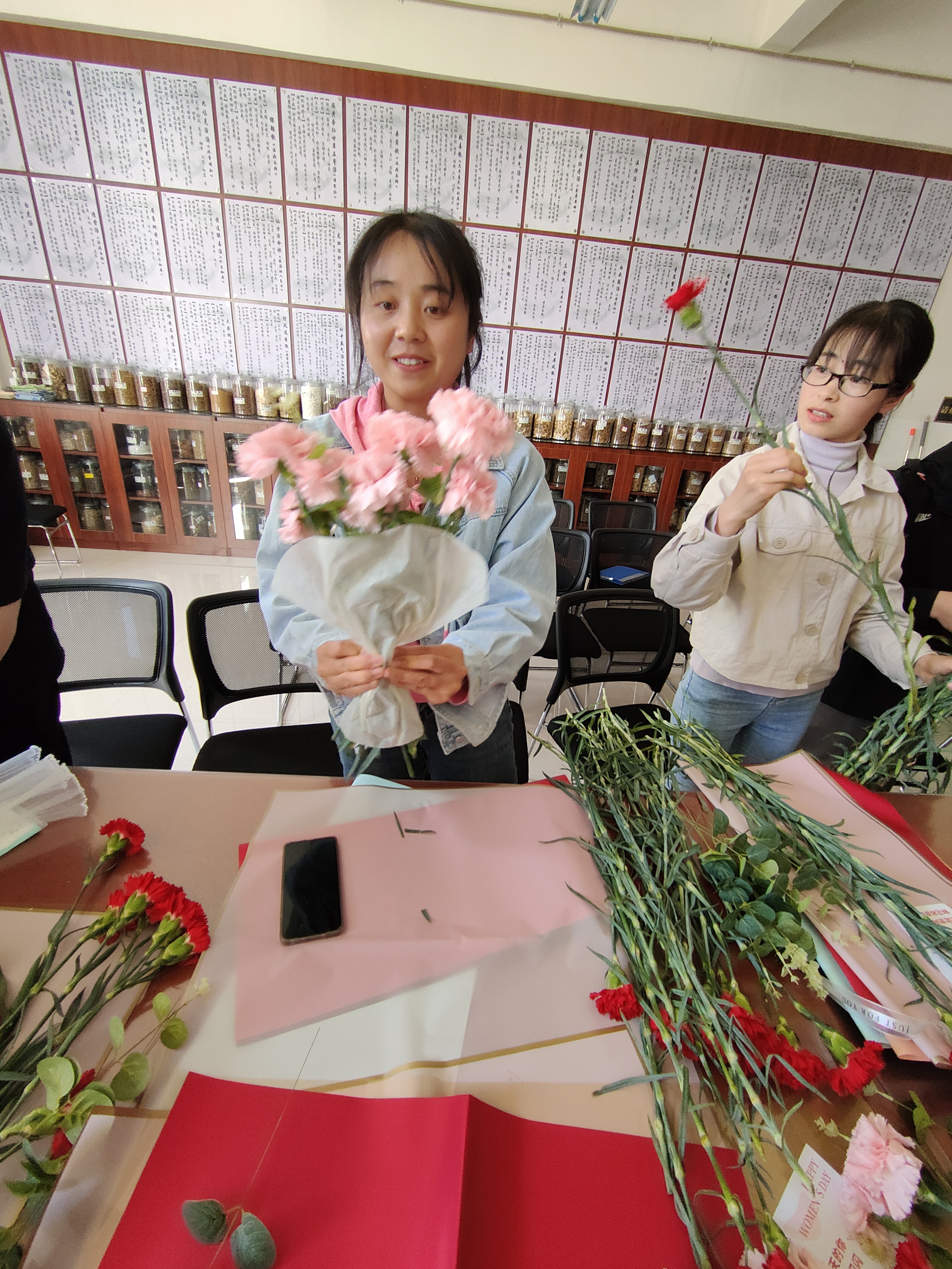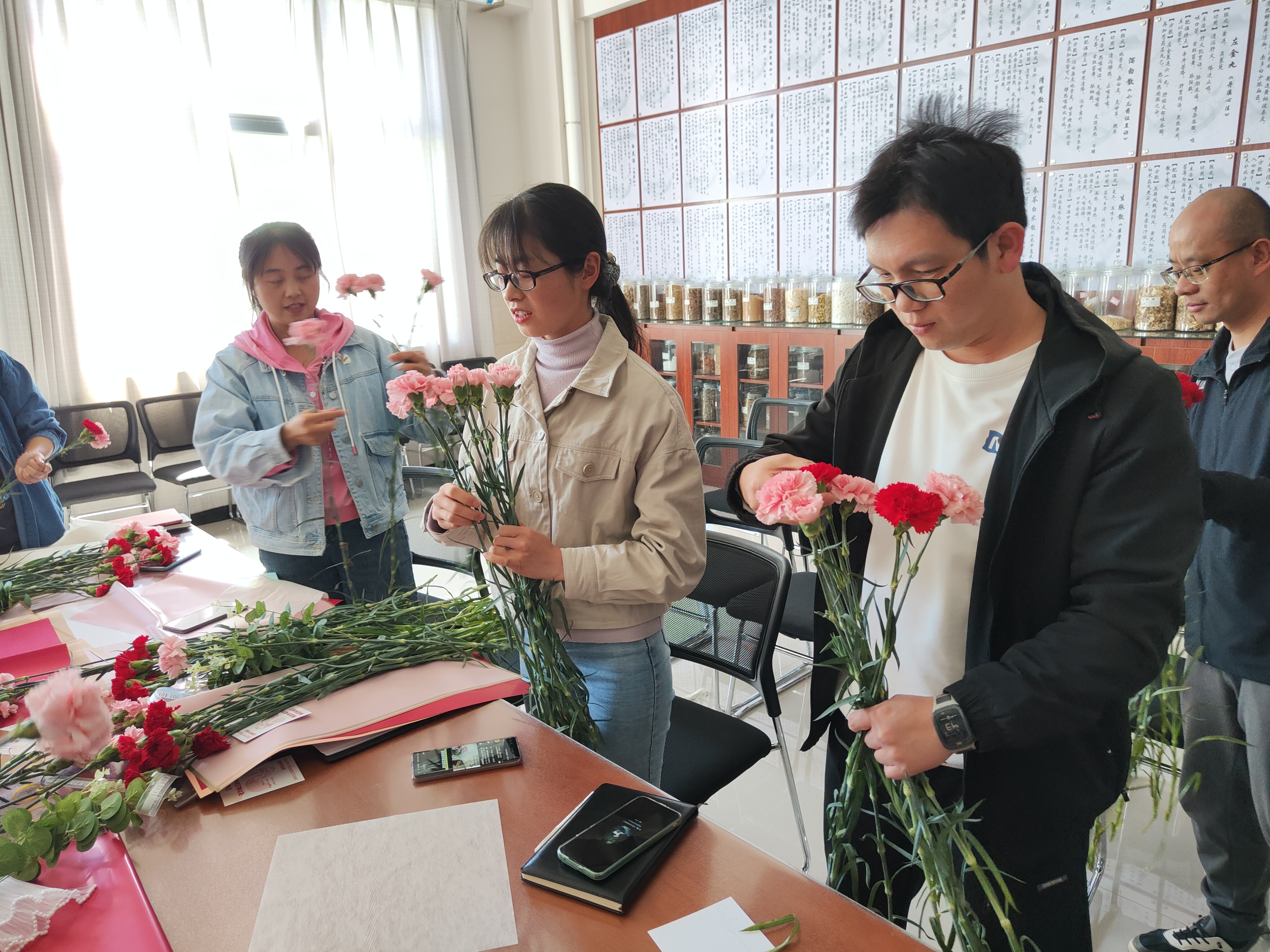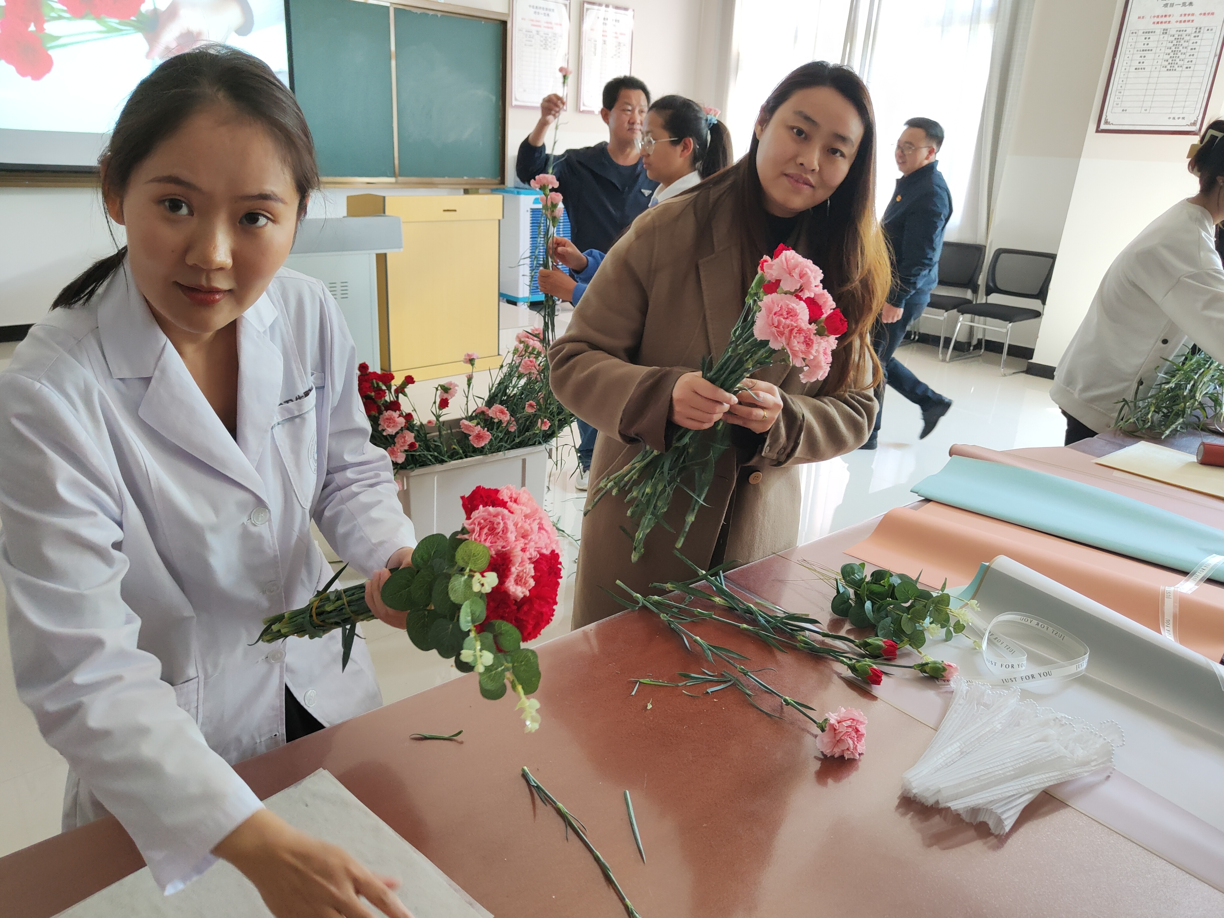接下来开展了包花活动,老师们纷纷跃跃欲试,发挥创造力,整合造型,使得原本普普通通的花草经过她们的巧手修剪后,错落有致地悄然绽放。大家看着自己创作的花束作品,也感到了满满的成就感与幸福感。包花,作为一门古老而优雅的艺术形式,有着广泛的用途。通过包花,可以表达情感、装饰环境、疏导心情。花朵是大自然的馈赠,不同的花朵有着不同的花语和象征意义。本次活动采用了粉色跟深红色的康乃馨,代表着深深的爱和关怀,以及尊敬之情。