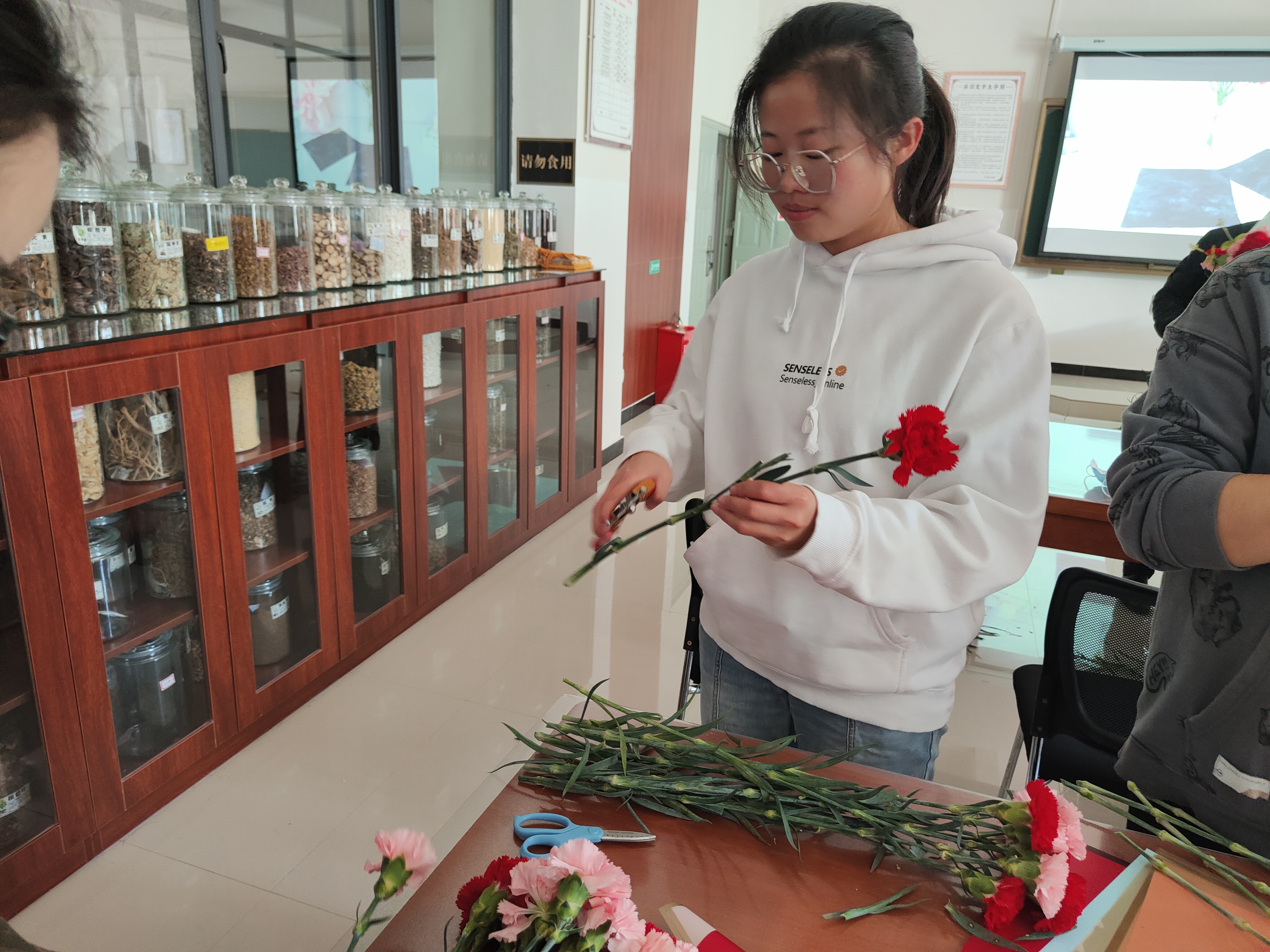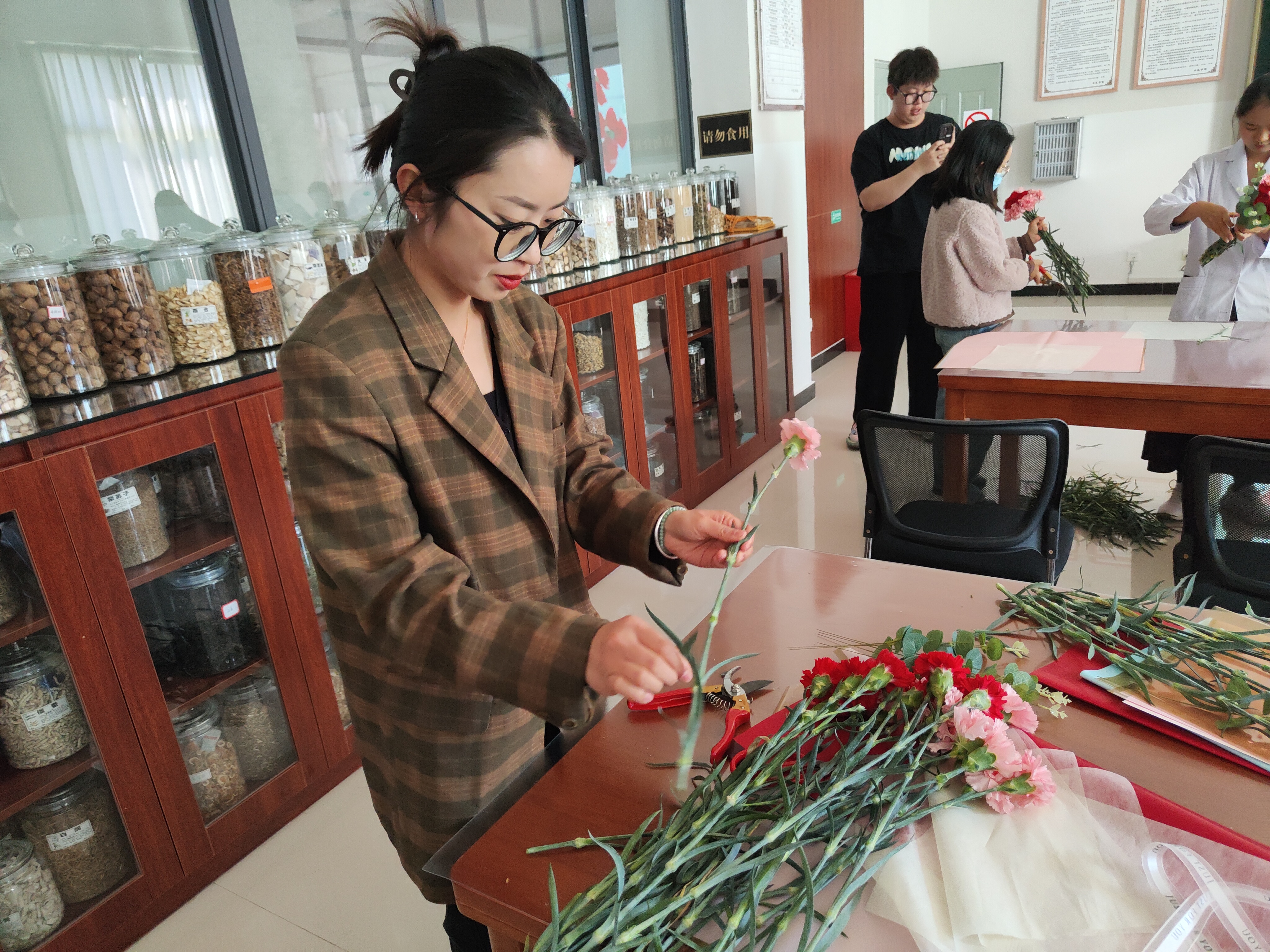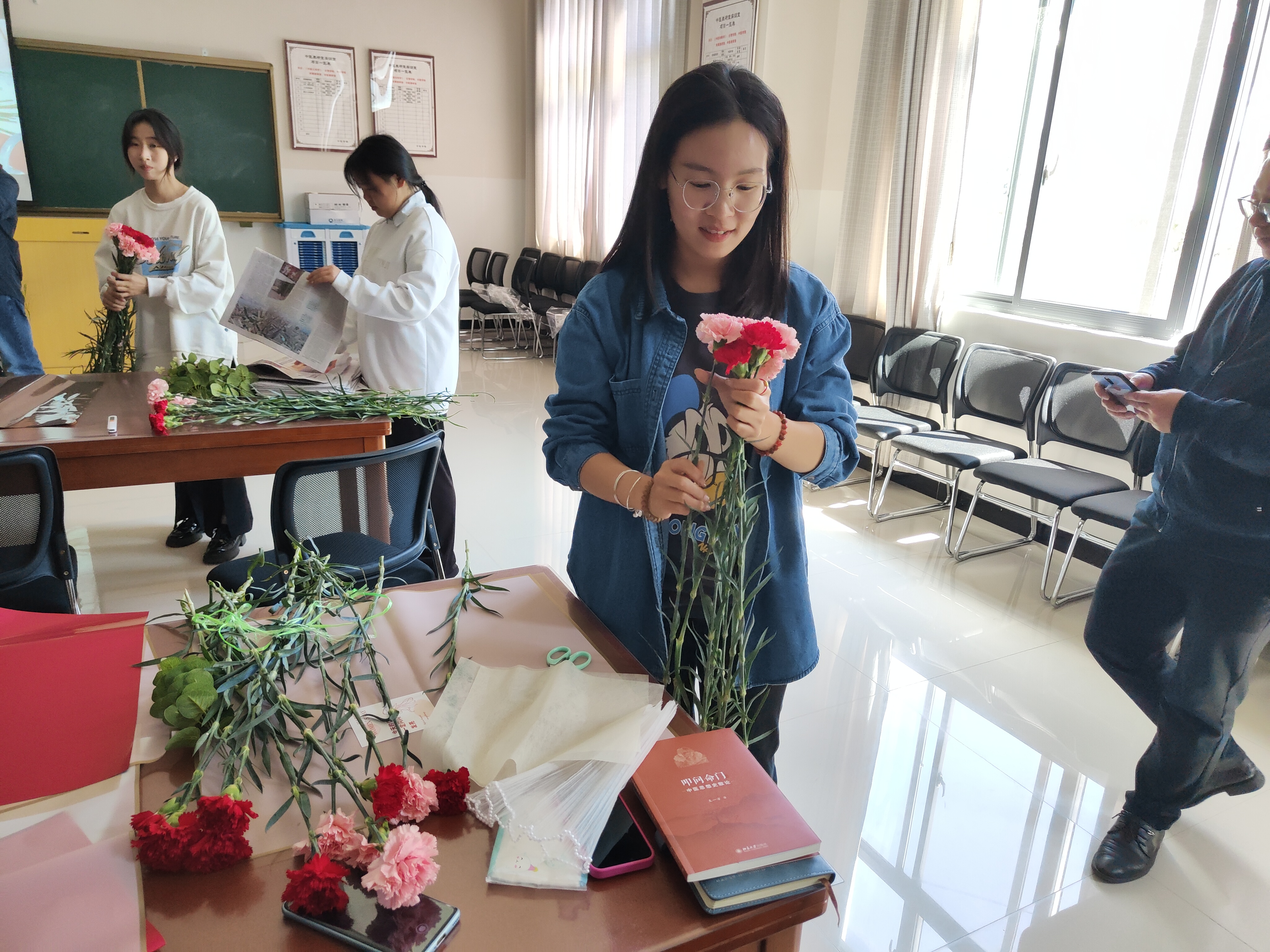 接下来开展了包花活动,老师们纷纷跃跃欲试,发挥创造力,整合造型,使得原本普普通通的花草经过她们的巧手修剪后,错落有致地悄然绽放。大家看着自己创作的花束作品,也感到了满满的成就感与幸福感。包花,作为一门古老而优雅的艺术形式,有着广泛的用途。通过包花,可以表达情感、装饰环境、疏导心情。花朵是大自然的馈赠,不同的花朵有着不同的花语和象征意义。本次活动采用了粉色跟深红色的康乃馨,代表着深深的爱和关怀,以及尊敬之情。