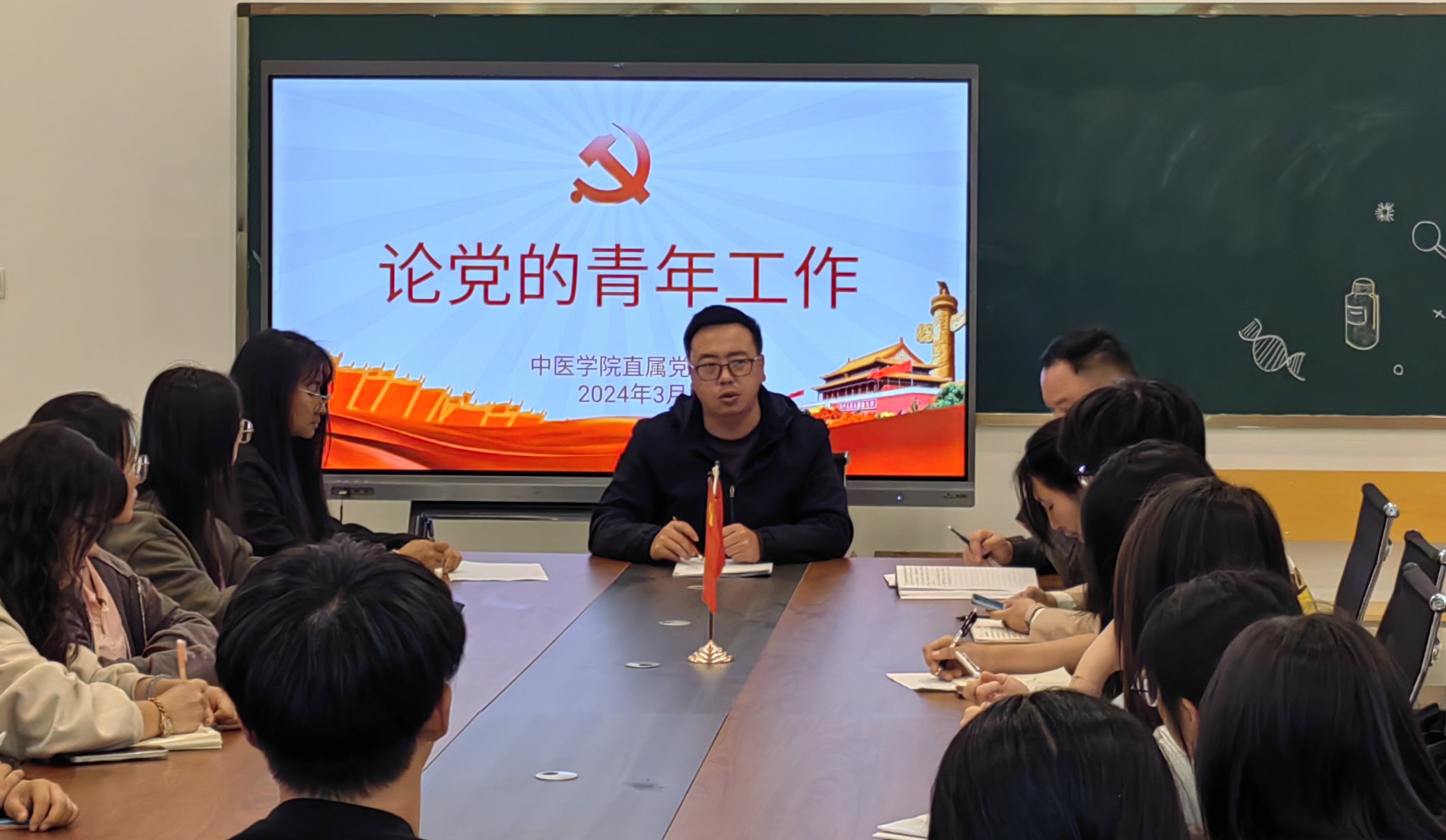 中医学院直属党支部书记易斯坐同志以“论党的青年工作”为题,主要围绕党的青年工作的历史、现状和未来发展方向进行了深入的探讨和交流。