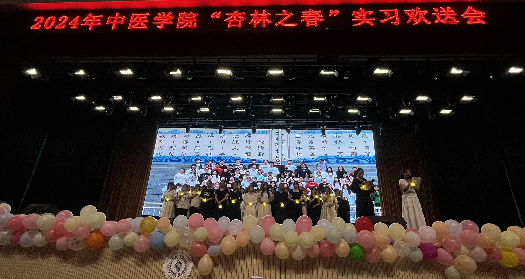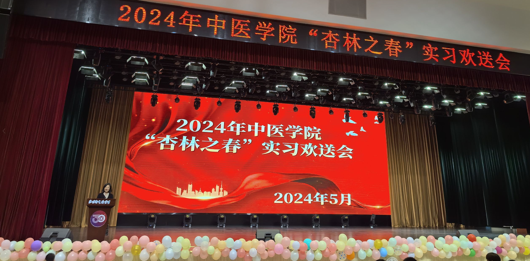 六月微风正好,花海飘香,春光尚未逝尽,离别近在咫尺,但即便岁月流逝,时光也带不走执着的梦,即便终将分别,距离也切不断真挚的师生情。为了欢送中医学院2022级实习生踏上临床实习的征程,展现他们勤奋好学、积极向上的精神风貌,同时增强实习生之间的凝聚力,中医学院于2024年5月29日晚在明德会堂举办了“杏林之春”欢送晚会。出席本次活动的领导有今年会官方网站党委副书记、院长龙雨霏同志,党委组织部部长、人事处处长张路同志,教务处处长孟州令老师,大学生工作部部长郭佶颖老师,各二级学院教学、学管副院长及中医学院全体师生,共计1700余人参加晚会。