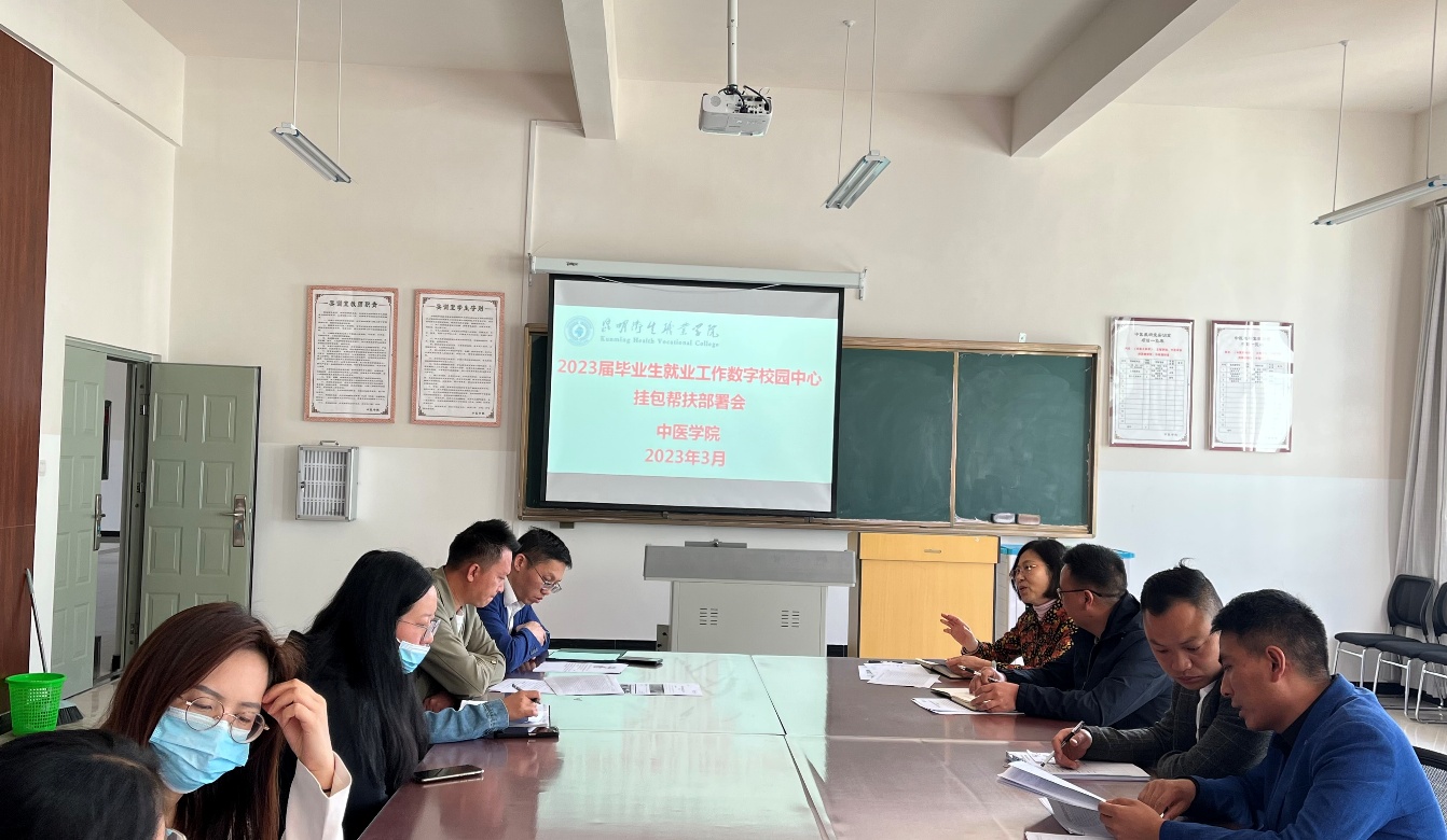 为全面落实党中央、国务院对高校毕业生就业创业工作的决策部署,按照省委省政府、省委教育工委、省教育厅关于做好高校毕业生就业创业工作的指示精神,根据《今年会官方网站关于印发2023 届毕业生就业创业工作实施方案的通知》要求和《今年会官方网站多部门联动帮扶2023届专科毕业生促就业行动方案》,结合中医学院2023届毕业生实际,2023年3月22日上午,中医学院召开数字校园中心挂包帮扶2023届毕业生就业工作部署会,会议由中医党总支书记易斯坐主持,中医党支部副书记余建坤、副院长黄承伟、魏泽正,数字校园中心主任王斌及教师、就业处处长施建飞、辅导员及科任教师出席会议。
